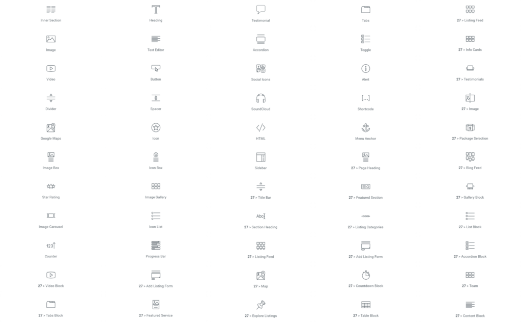 Elementor widgets 50+ Elements available to design pages out of the box. Add more using elementor plugins and addons